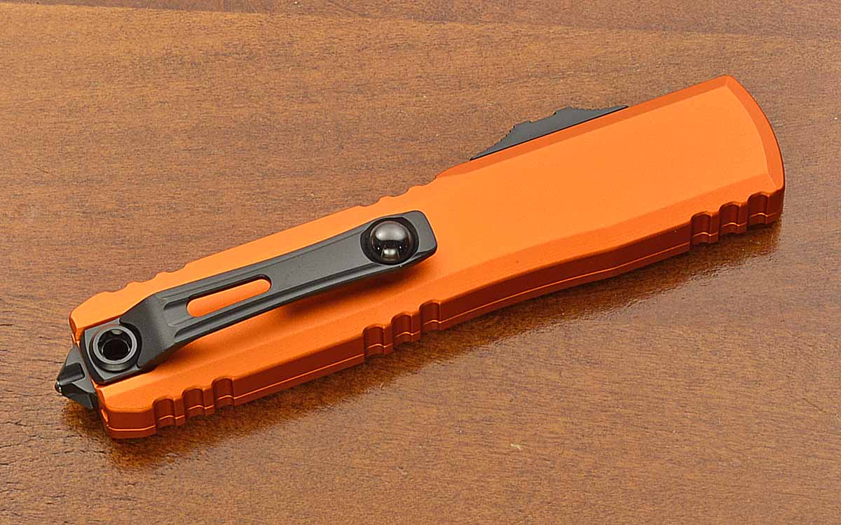 - Black coated titanium pocket clip with ceramic ball bearing interface and finial with ball bearing window breaker