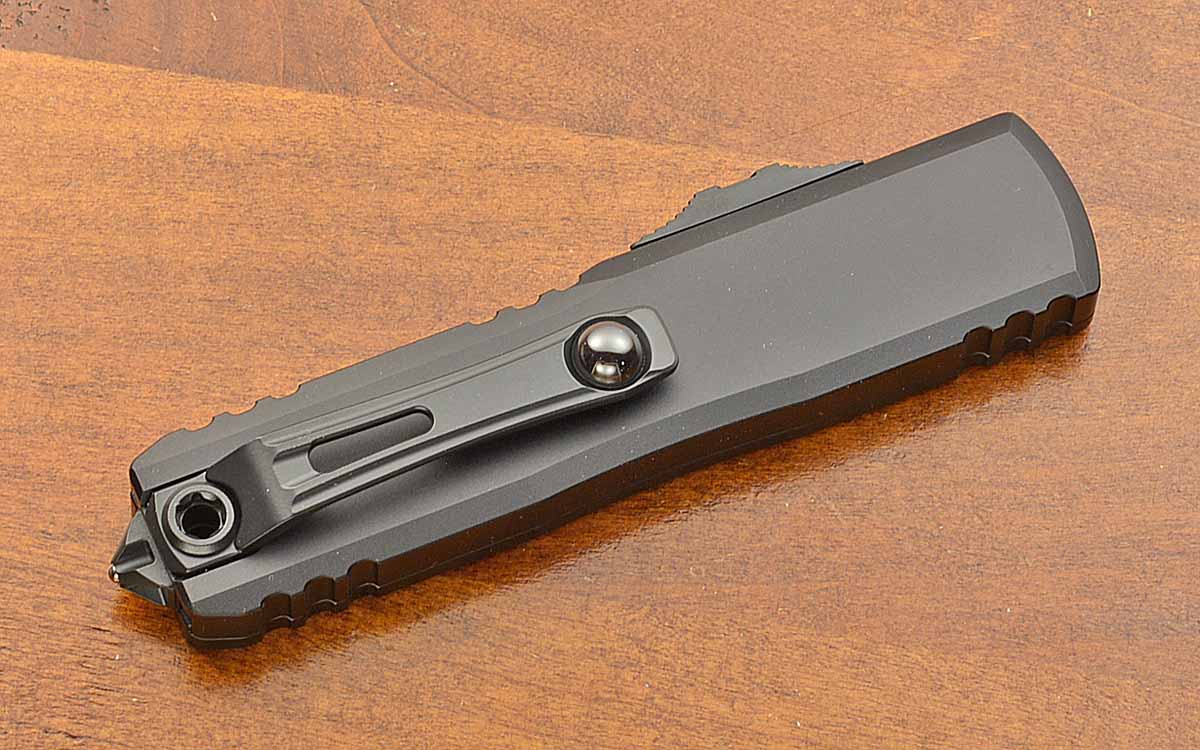 - Black coated titanium pocket clip with ceramic ball bearing interface and finial with ball bearing window breaker