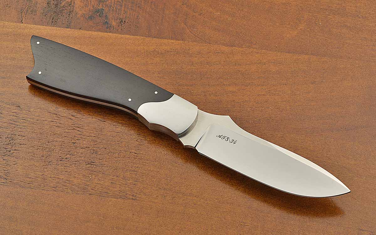 - 3 7/8" blade of ATS 34, mirror polished hollow grind, satin finished flats, 8 3/8" overall length