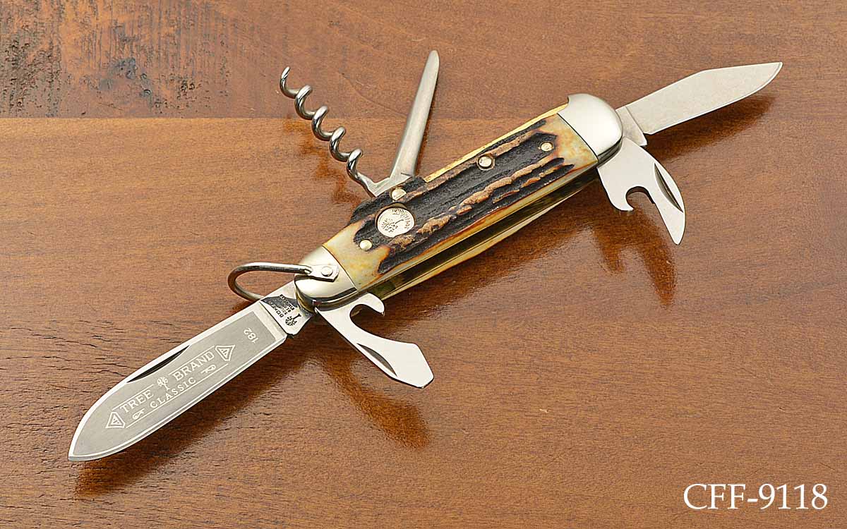 - Other stainless tools include can opener, bottle opener with flat screwdriver, cork screw, and awl