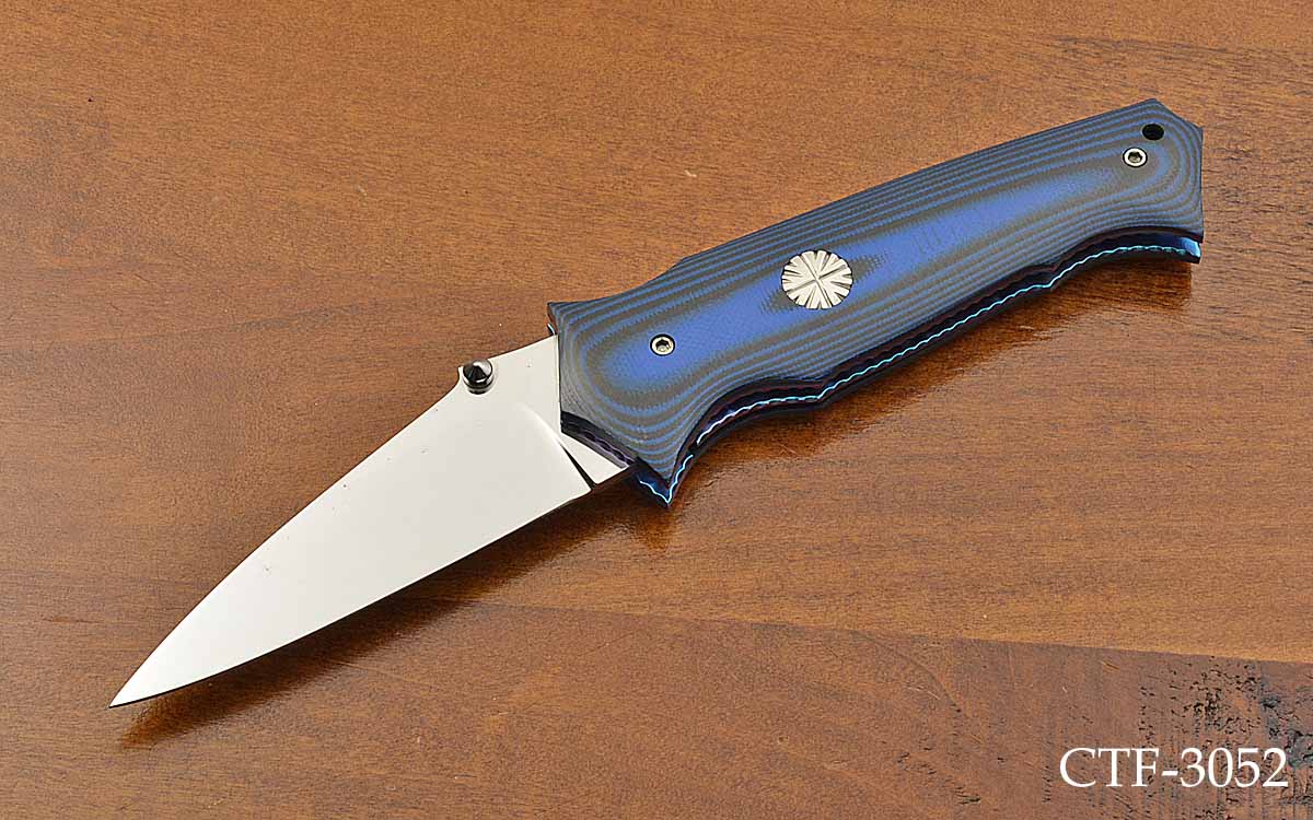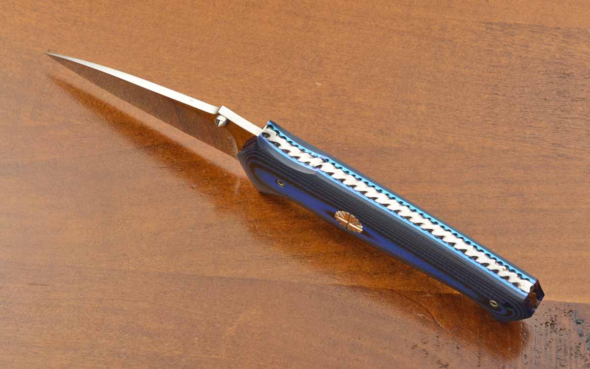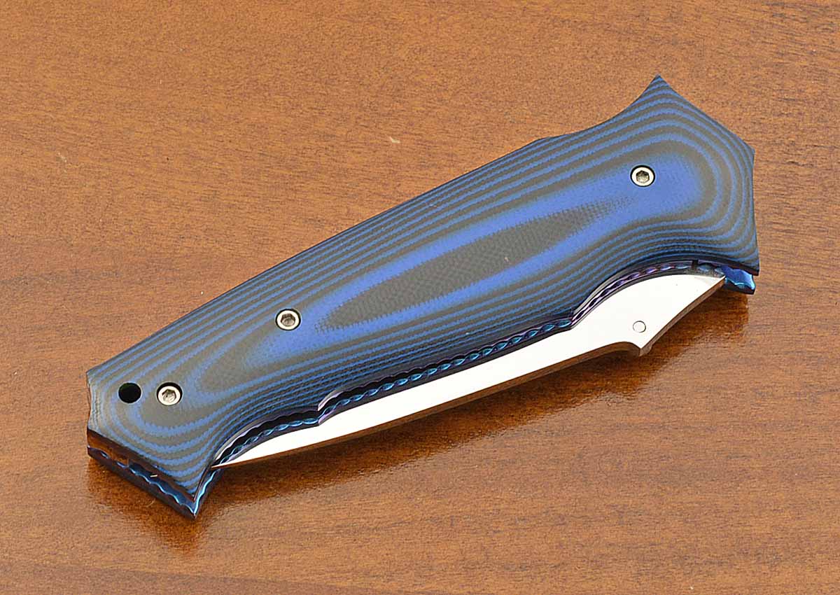 - Black and blue G10 scales with fancy filed stainless steel release button