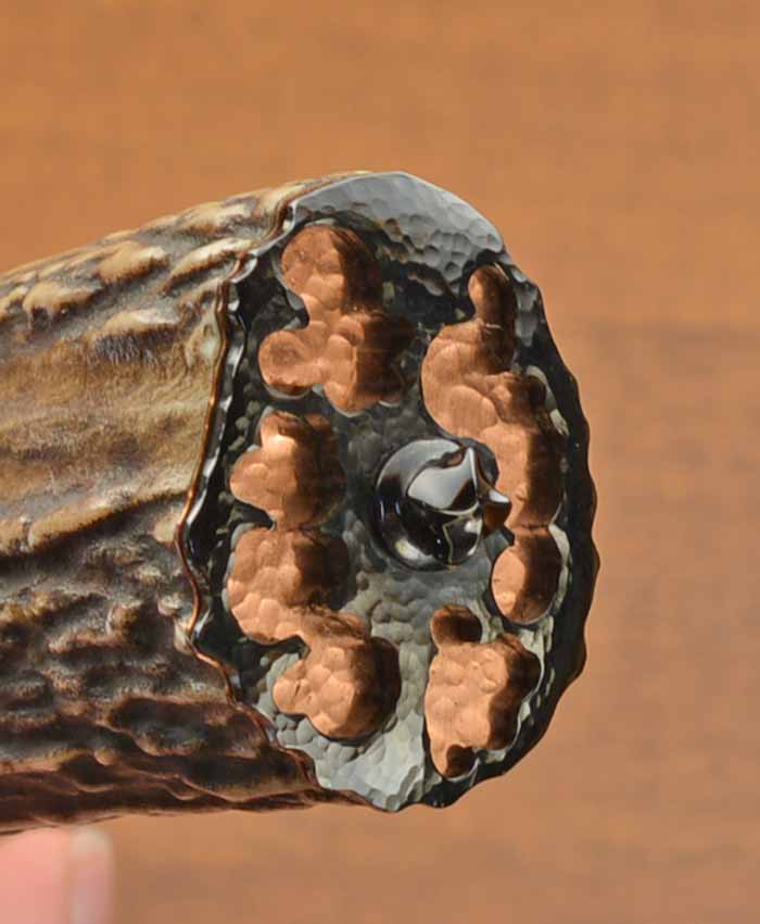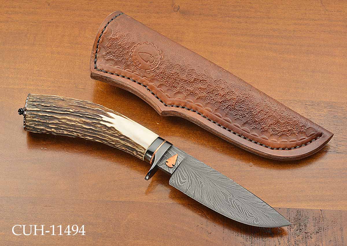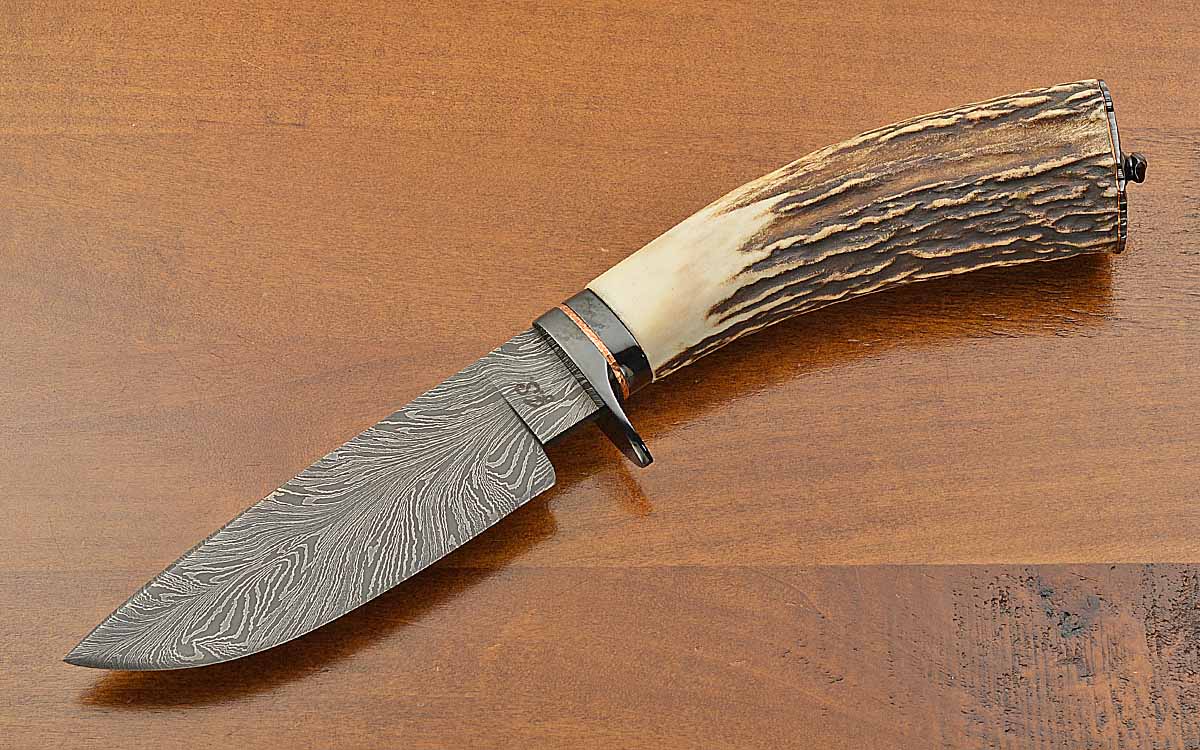 - 5" Feather Damascus blade, forged by maker, 10 3/8" overall length