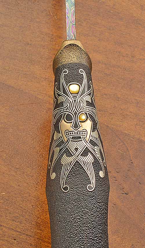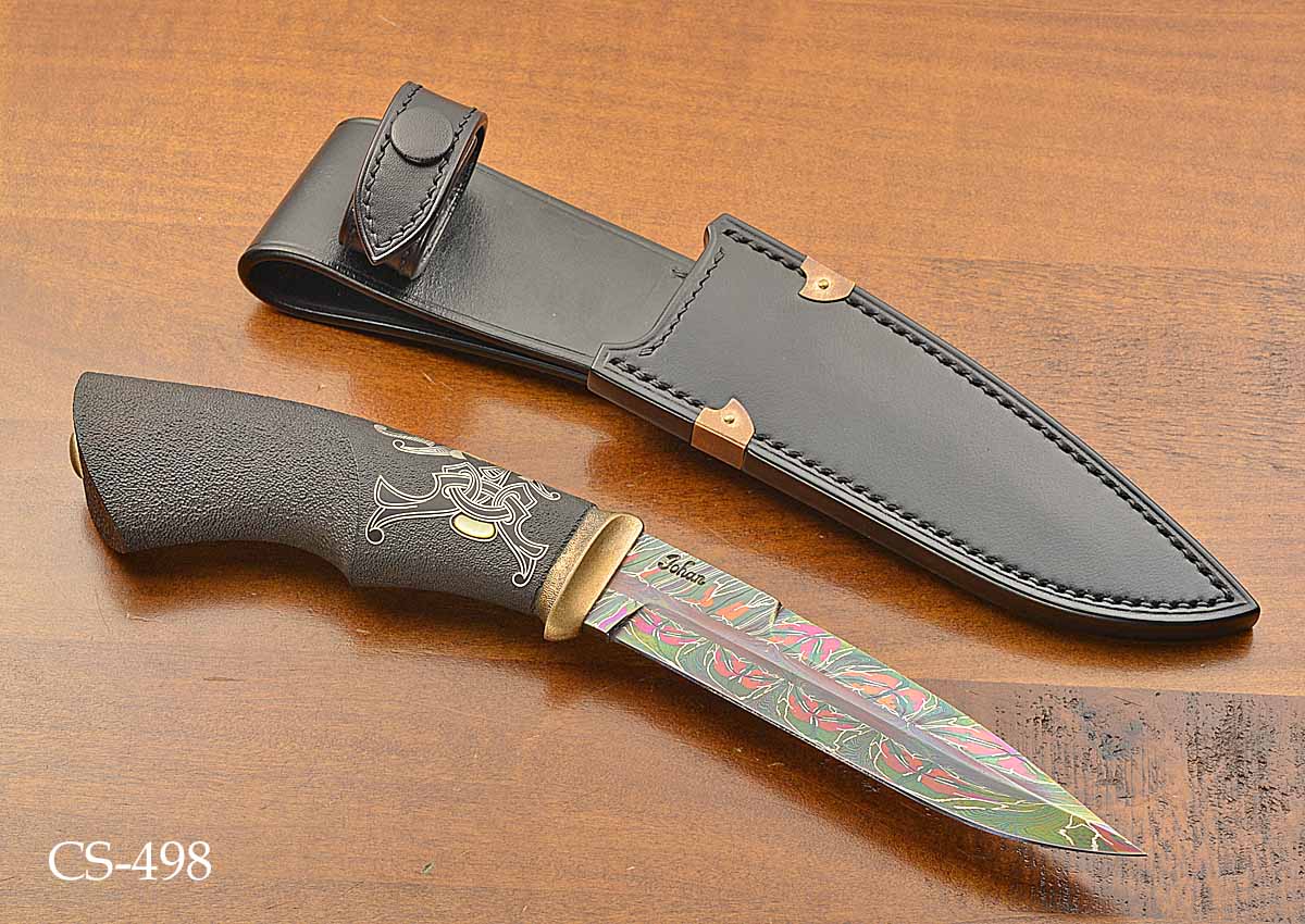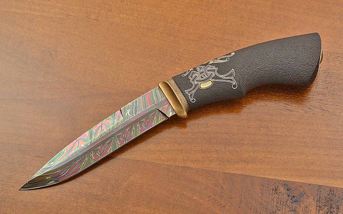 - 5 1/16" colored mosaic Damascus blade, forged by JOHAN GUSTAFSSON, 9 7/8" overall length